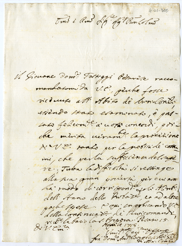 Lettera di Domenico Andrea Borghesi al Cardinale Annibale Albani (1715 aprile 15)