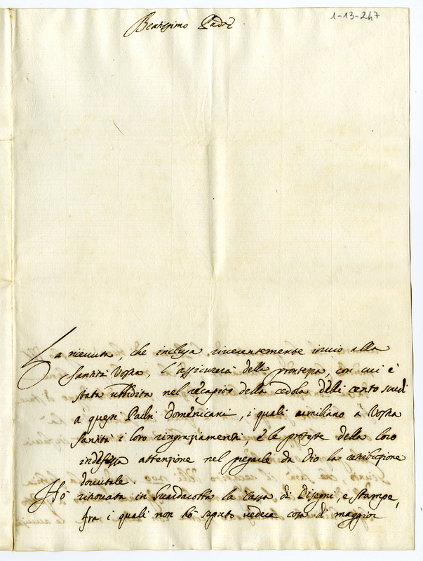 Ringraziamento al papa per i 100 scudi in moneta romana inviati tramite Carlo Albani per terminare la copertura della chiesa di San Domenico