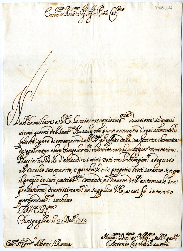 Lettera di Antonio Cesare Bavieri al cardinale Annibale Albani (1712 dicembre 21)