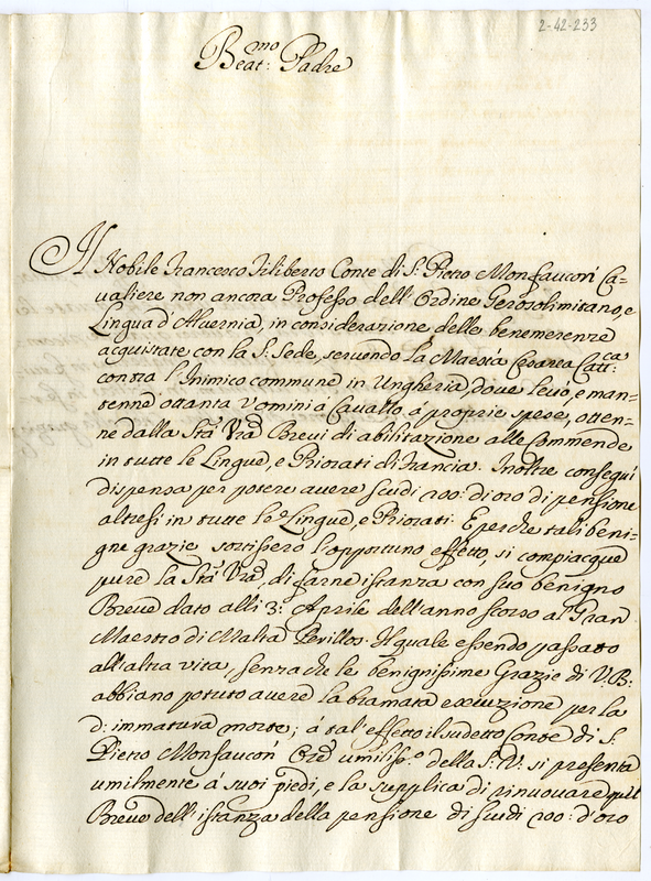 Lettera di Francesco Filiberto Conte di San Pietro Monfaucon Gerosolimitano a papa Clemente XI (1720)