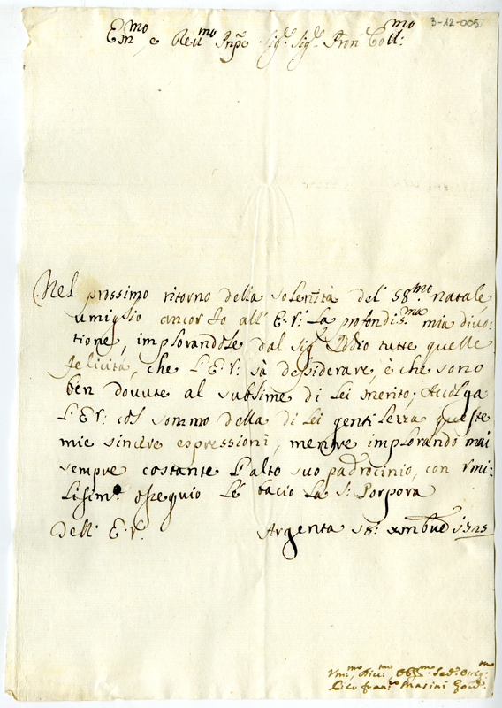 Lettera di Pier Francesco Masini al cardinale Annibale Albani (1725 dicembre 18)