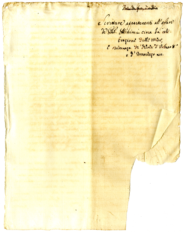 Scritture appartenenti all'affare de Padri Minimi circa la celebrazione delle messe, e osservanza de decreti d'Urbano 8° e d'Innocenzo XII