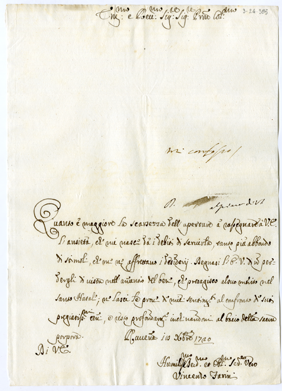 Lettera di Vincenzo Farini al cardinale Annibale Albani (1720 dicembre 18)