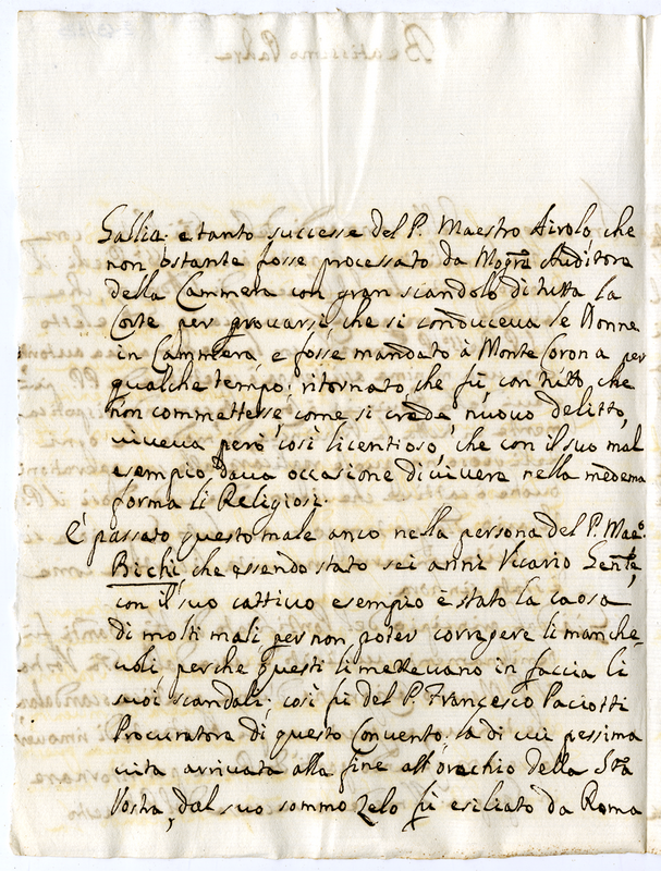 Espone la difficile situazione morale e giuridica del convento di San Adriano e in particolare la condotta del padre maestro Bichi vicario generale