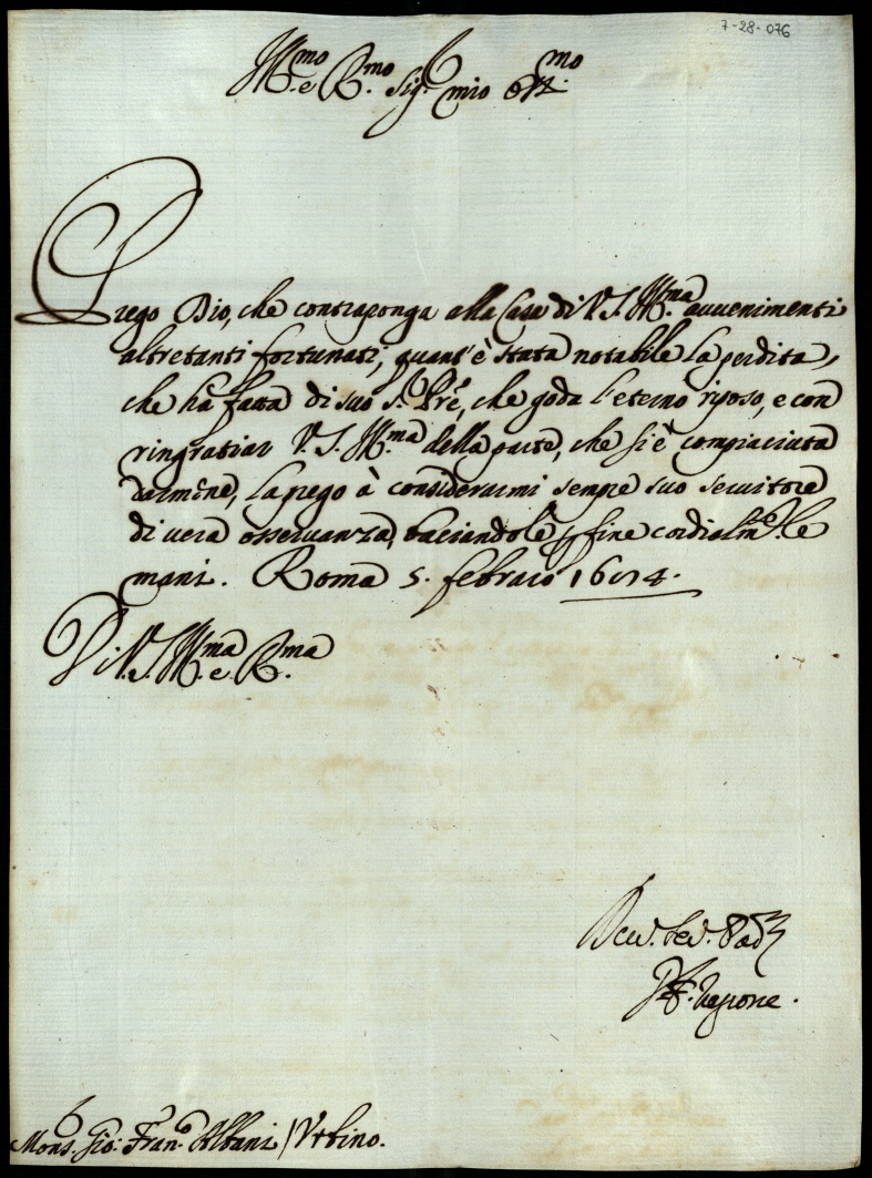 Lettere di personaggi scritte a Monsignor Albani in condoglianza della morte del Signor Carlo suo padre