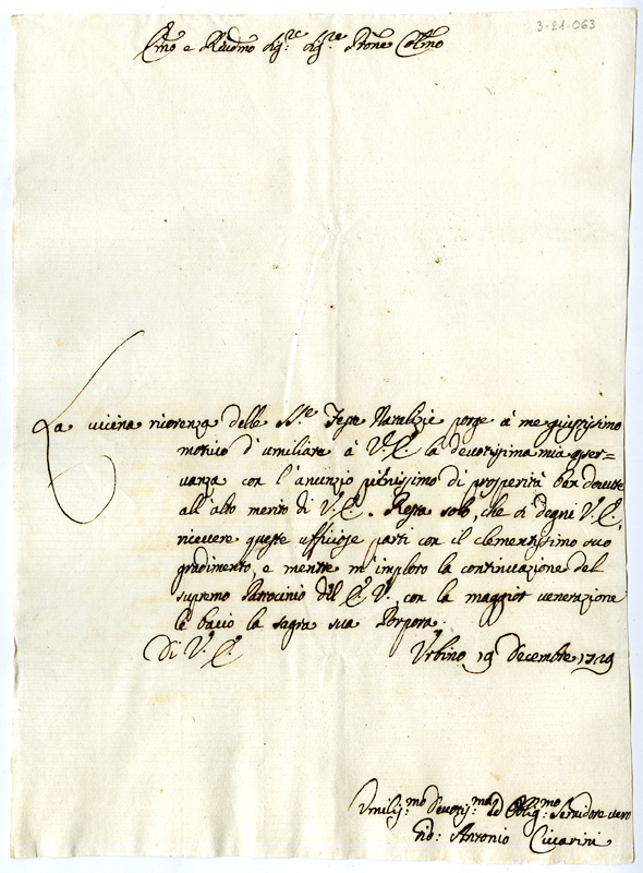 Lettera di Bernardino Manfrini al cardinale Annibale Albani (1729 dicembre 15)