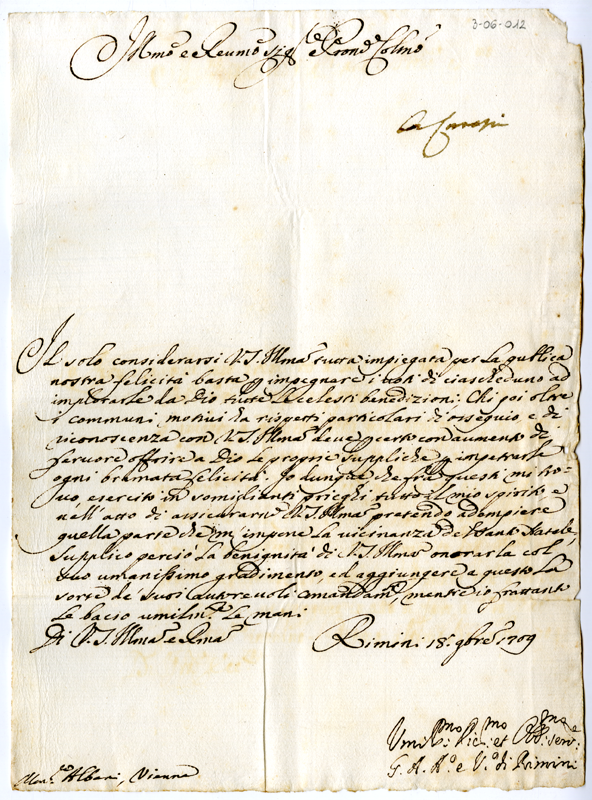 Lettera del vescovo di Rimini ad Annibale Albani (1709 novembre 18)