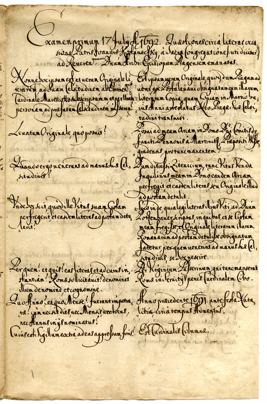 Examen primum 17 july 1692. Quaestiones circa literas, occasione patris Joannis Kostanesky, a Sacra Congregatione (uti dicitur) ad reverend. dominum [...] episcopum pragensem emanatus