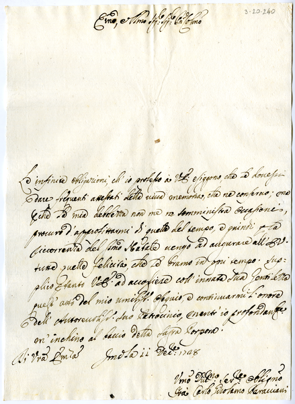 Lettera di Carlo Girolamo Paracciani al cardinale Annibale Albani (1728 dicembre 11)