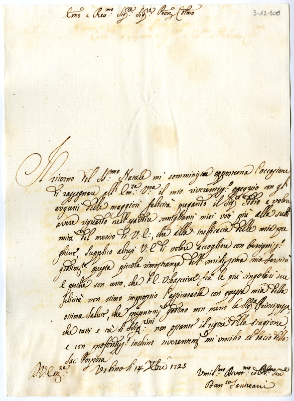 Lettera di Domenico Sandreani al cardinale Annibale Albani (1725 dicembre 14)