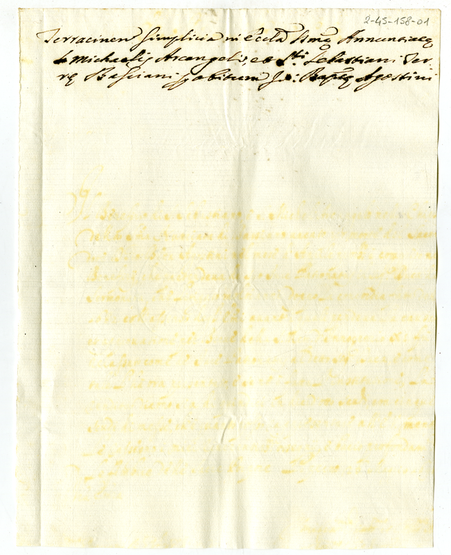 Nota sul beneficio di San Michele Arcangelo e San Sebastiano della chiesa della Santissima Annunziata di Basssiano vacato per morte di Giovanni Battista Agostini (1698)