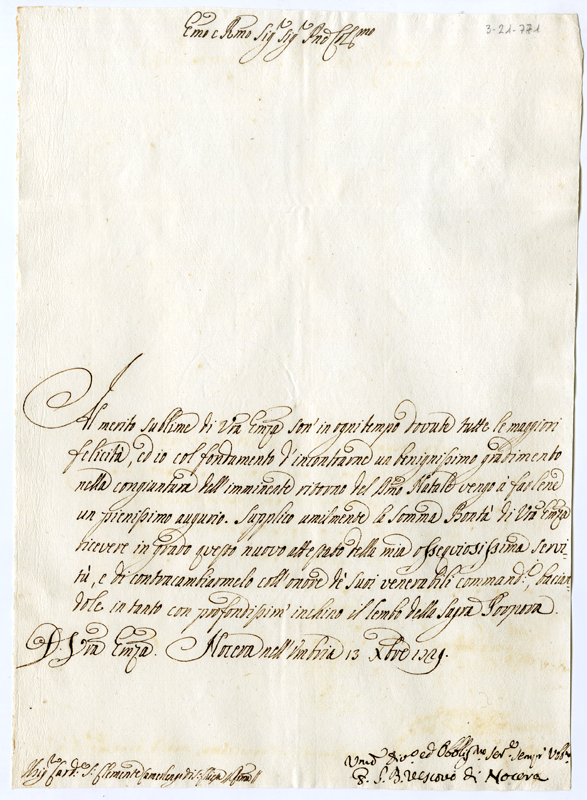 Lettera di Giovanni Battista vescovo di Nocera al cardinale Annibale Albani (1729 dicembre 13)