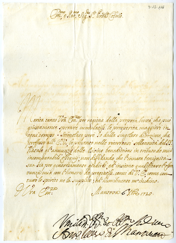 Lettera di Antonio vescovo di Mantova al cardinale Annibale Albani (1725 dicembre 6)