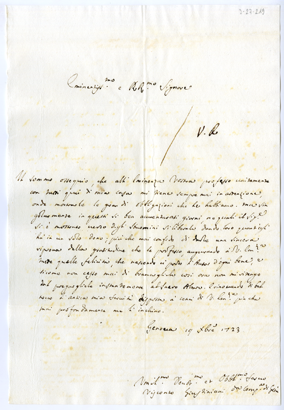 Lettera del visconte Giustiniani della compagnia di Gesù al cardinale Annibale Albani (1723 dicembre 19)
