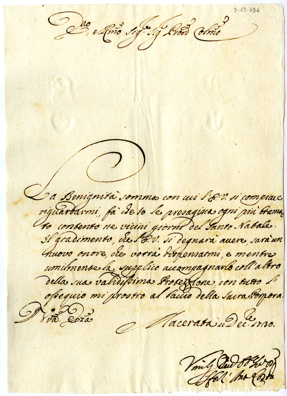 Lettera di Sforza Antonio Costa al cardinale Annibale Albani (1730 dicembre 11)