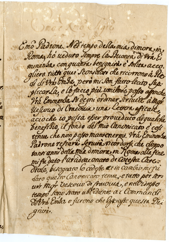 Oltre agli auguri natalizi chiede che il cardinale intervenga presso il vescovo di Cracovia affinchè gli venga concesso qualche altro beneficio.