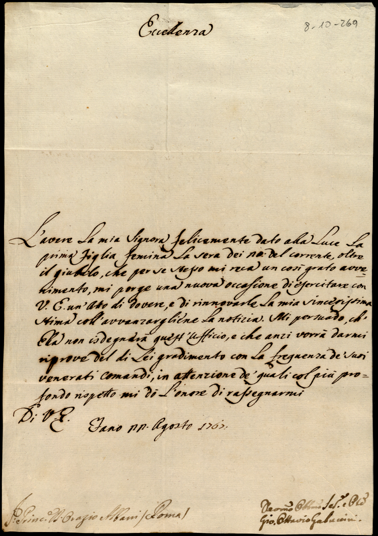 Lettere ricevute in Urbino dal Signor Principe Orazio Albani ultimo di questo nome nell'anno 1767