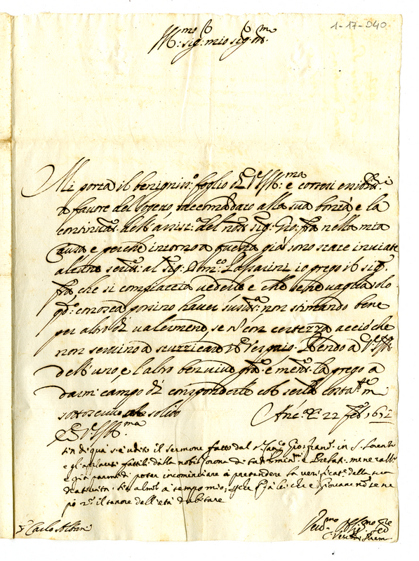 Lettera di Carlo Nembrini, vescovo di Parma, a Carlo Albani (1672 febbraio 22)