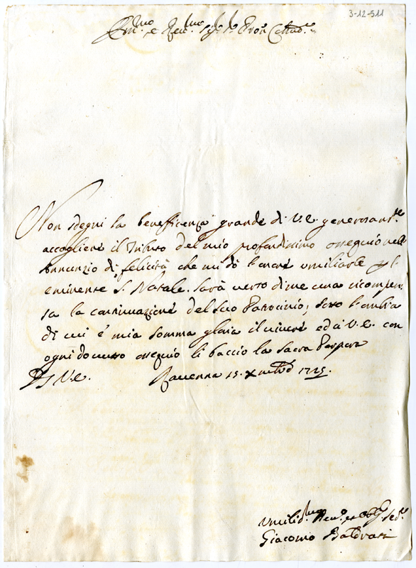 Lettera di Giacomo Baldrati al cardinale Annibale Albani (1725 dicembre 15)