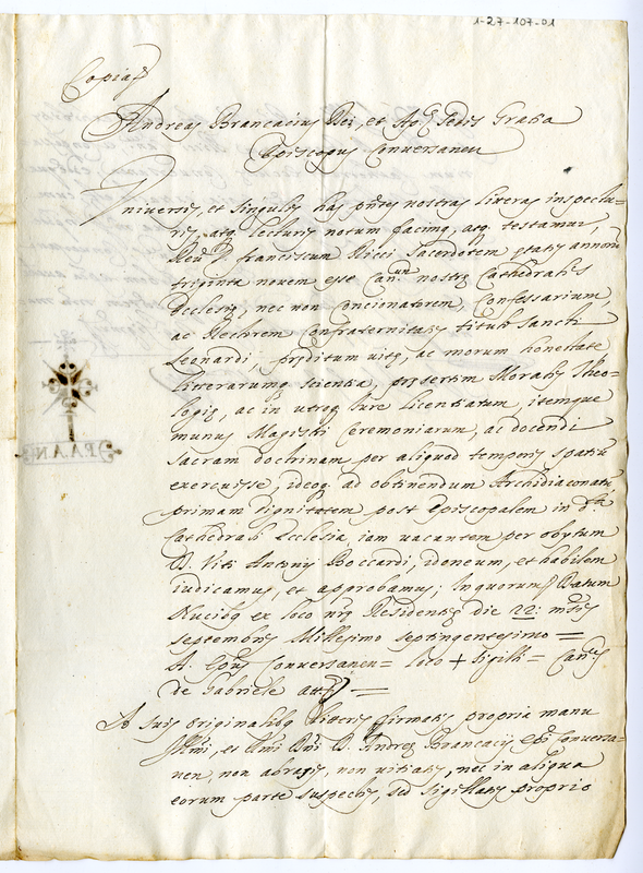 Copia. Attestazione del Vescovo di Conversano Andrea Brancaccio a fovare di don Francesco ricci (1700 settembre 22)