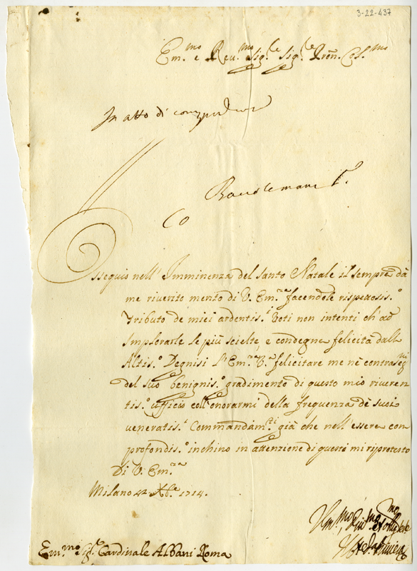 Lettera del conte da Riviera al cardinale Annibale Albani (1714 dicembre 12)