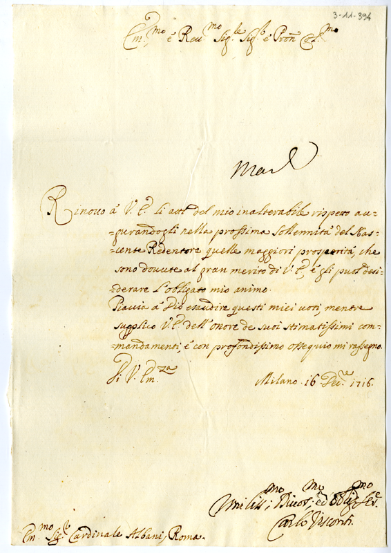 Lettera di Carlo Visconti al cardinale Annibale Albani (1716 dicembre 16)