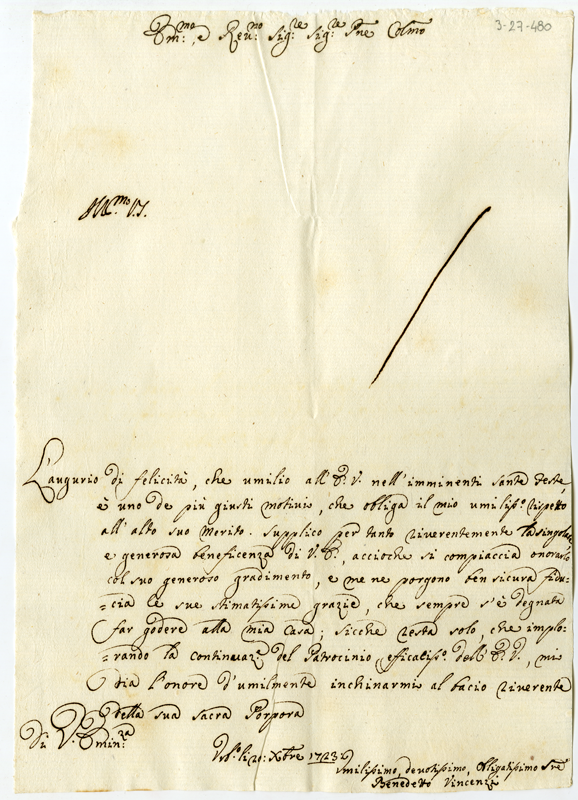 Lettera di Benedetto Vincenzi al cardinale Annibale Albani (1723 dicembre 20)