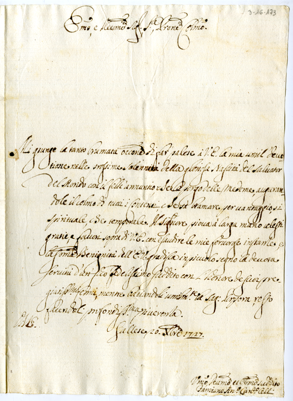Lettera di Famiano Antonio Celli al cardinale Annibale Albani (1727 dicembre 20)