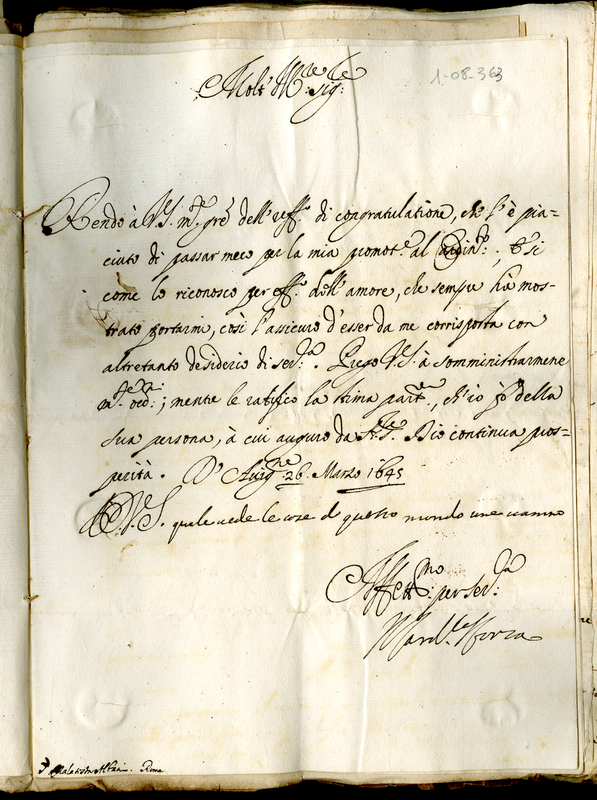 Lettera del cardinale Sforza Federico a Malatesta Albani (1645 marzo 26)