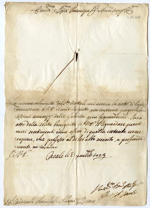 Lettera del vescovo di Casale al cardinale Annibale Albani (1723 dicembre 8)
