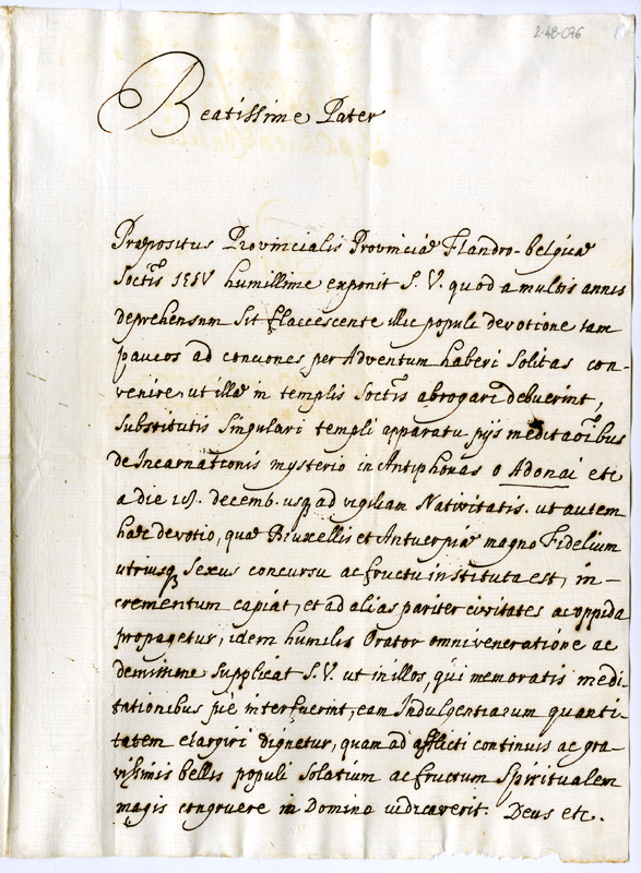 Lettera del padre provinciale dei gesuiti della provincia flandrio- belgica a papa Clemente XI (1700-1721)