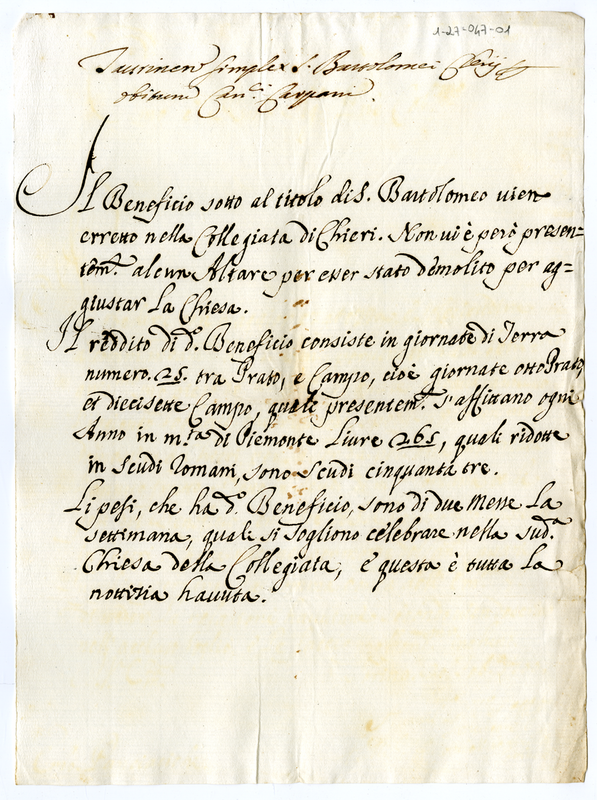 Sul beneficio sotto il titolo di San Bartolomeo nella collegiata di Chieri vacante per morte del Canonico Carpani (1700)