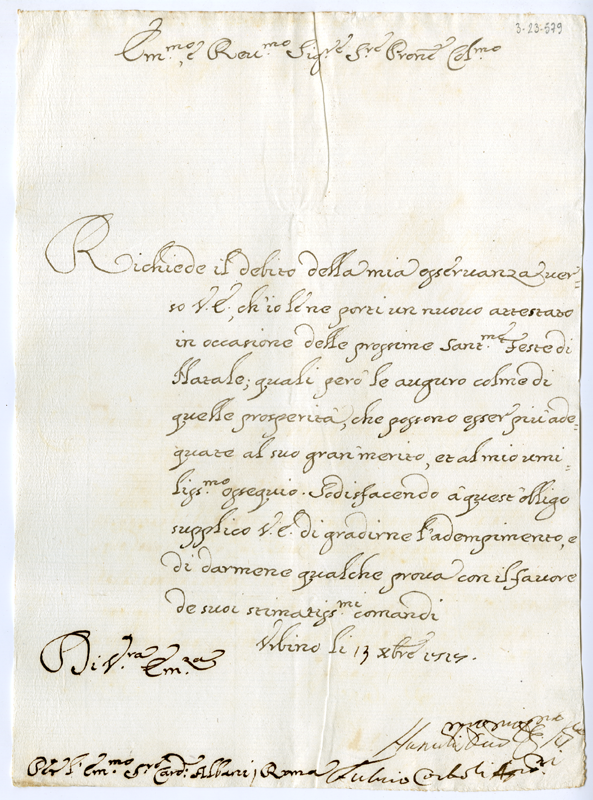 Lettera di Fulvio Corboli Aquilini al cardinale Annibale Albani (1717 dicembre 13)