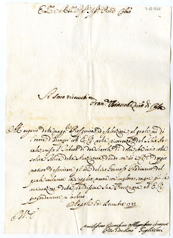 Lettera di Pier Girolamo Guglielmi al cardinale Annibale Albanbi (1725 dicembre 18)