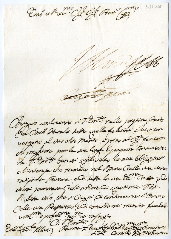 Lettera di Camillo vescovo di Parma al cardinale Annibale Albani (1714 dicembre 7)