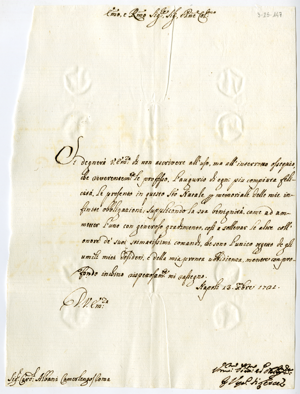 Lettera di Fabrizio vescovo di Lecce al cardinale Annibale Albani (1721 dicembre 13)