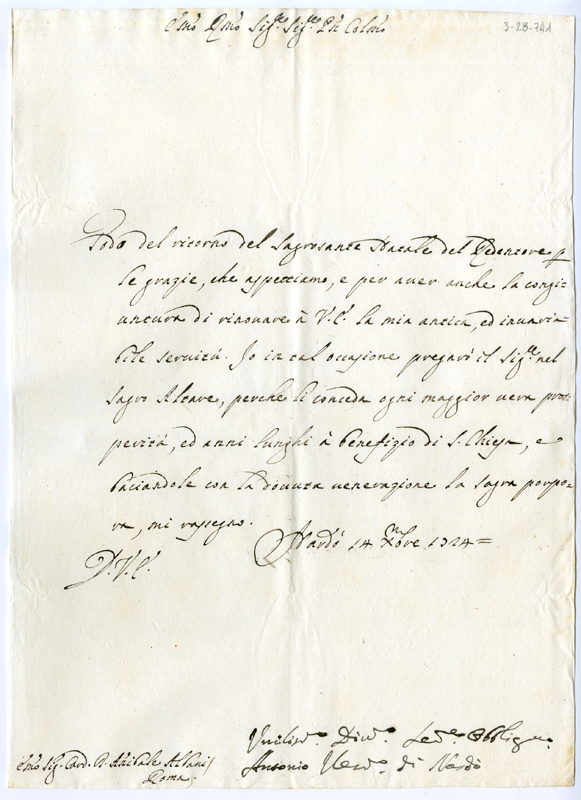 Lettera di Antonio vescovo di Nardò al cardinale Annibale Albani (1724 dicembre 14)