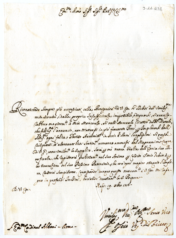 Lettera di Francesco Onofrio vescovo di Bitetto al cardinale Annibale Albani (1716 dicembre 19)
