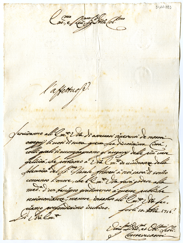 Lettera dei conservatori della città di Forlì al cardinale Annibale Albani (1716 dicembre 10)