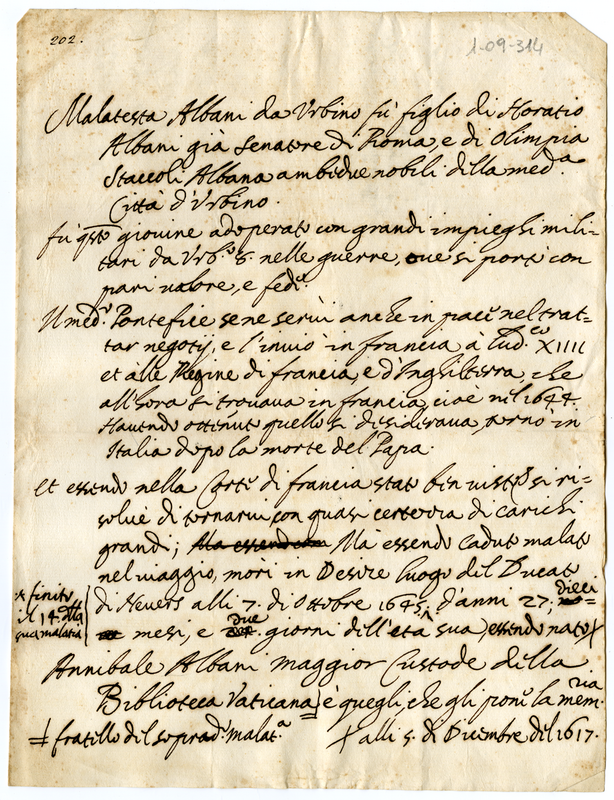 | dc.description | Nascita, impieghi, morte di Malatesta Albani, foglio scritto da Orazio Albani | |