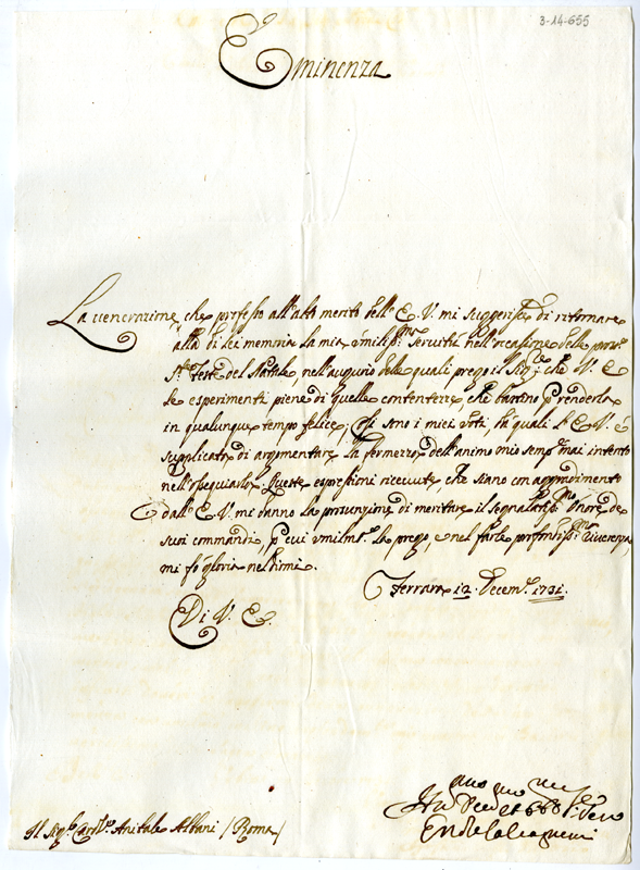 Lettera di Ercole Calcagnini al cardinale Annibale Albani (1731 dicembre 12)