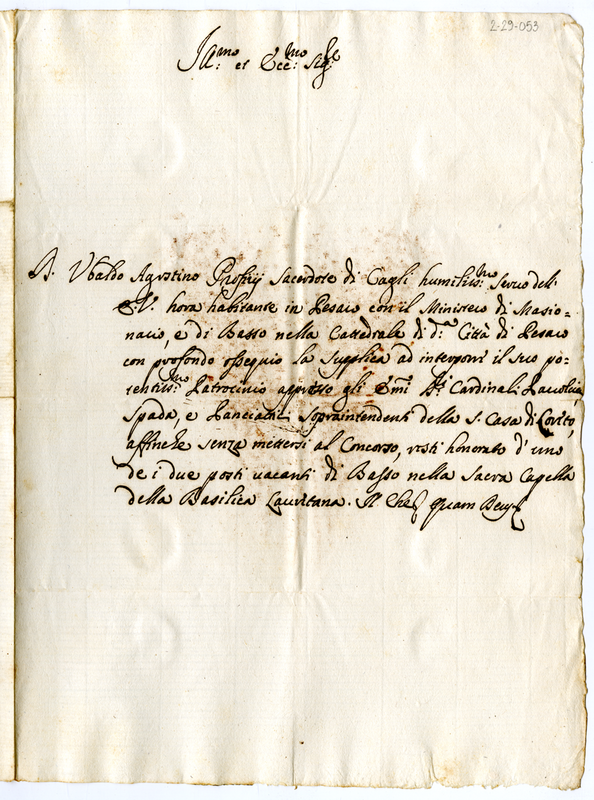 Supplica di interporre il proprio patrocinio per avere un posto vacante di basso nella basilica di Loreto senza concorso