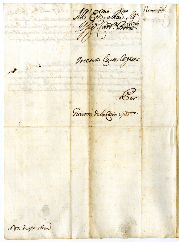 Lettera di Giacomo De La Croix spedizioniere al cardinale Prodatario (1687)