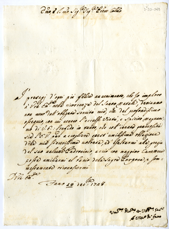 Lettera di Alessandro vescovo di Fano al cardinale Annibale Albani (1728 dicembre 10)
