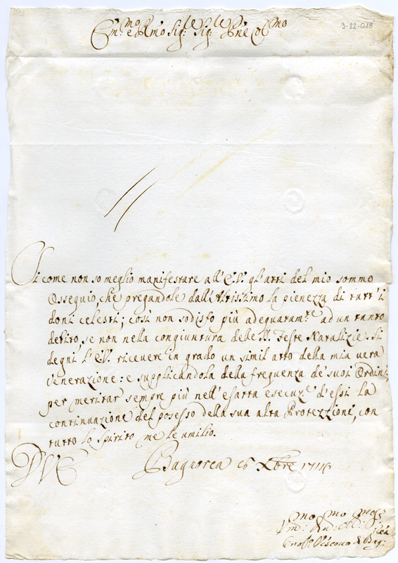 Lettera di Onofrio vescovo di Bagnorea al cardinale Annibale Albani (1714 dicembre 8)