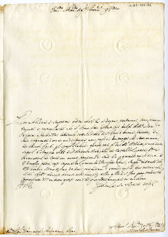 Lettera di Giuseppe Antonio Barino al Cardinale Panciatici (1698 agosto 10)