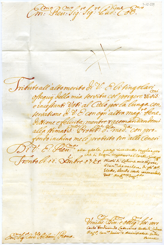 Lettera di Carlo Ferdinando Laterano conte di Lodrone al cardinale Annibale Albani (1725 dicembre 11)