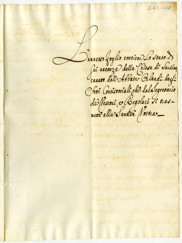 Si trasmette l'annesso foglio relativo alle vacanze della chiesa di Sarsina (1700-1721)