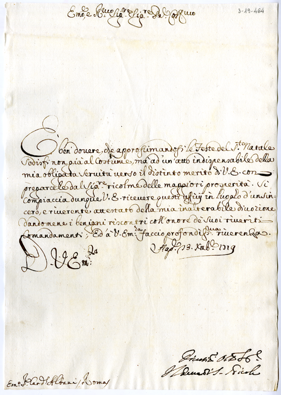Lettera del duca di San Nicola al cardinale Annibale Albani (1719 dicembre 23)