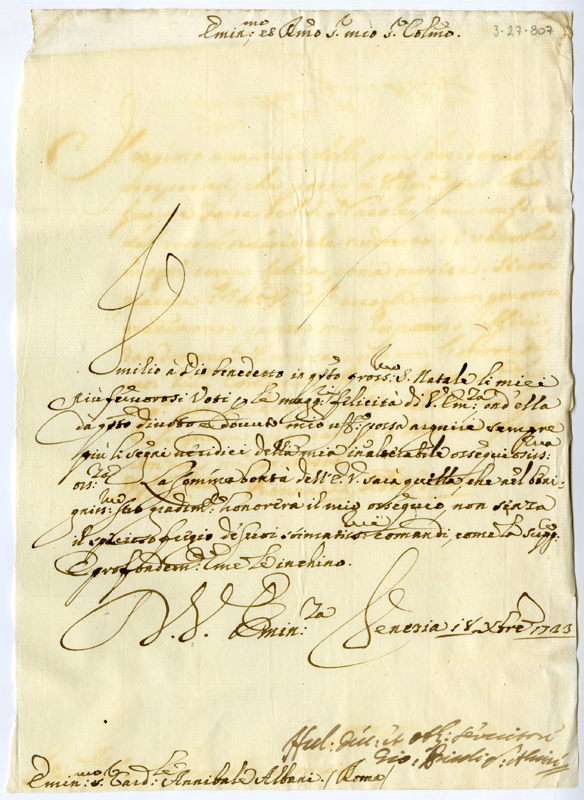 Lettera di Giovanni Priuli Alvise al cardinale Annibale Albani (1723 dicembre 18)